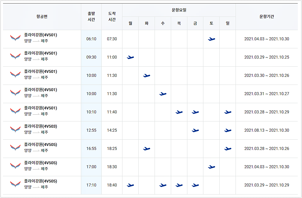 ※ 양양 - 제주 비행기 시간표(양양 출발)