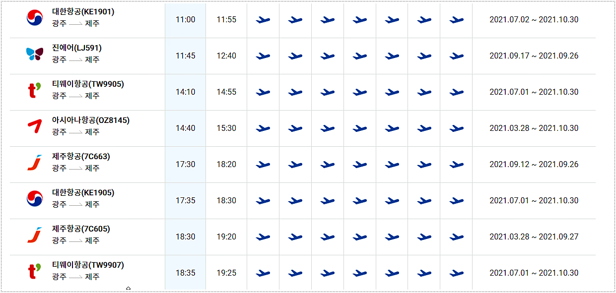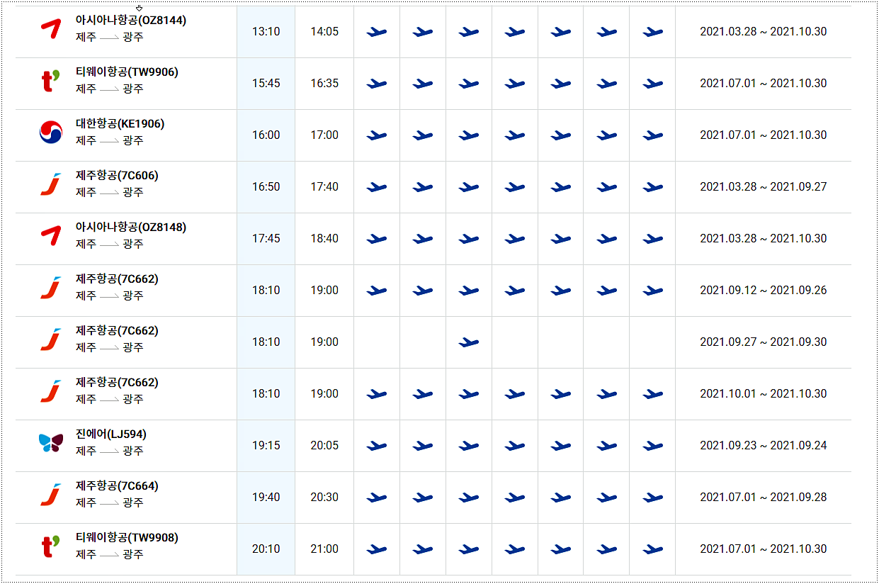 광주광역시에서 제주도로 가는 항공편의 시간표입니다. 티웨이항공, 제주항공, 아시아나항공, 대한항공, 진에어에서 광주-제주간 노선을 운행하고 있는데요. 운항기간에 따른 출발시간 및 도착시간 확인해보시기 바랍니다.